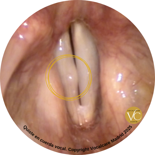 Videoestroboscopia laríngea que muestra un quiste de aspecto mucoso y translúcido localizado en el tercio medio de la cuerda vocal derecha. La lesión protruye hacia el borde libre, generando una asimetría evidente durante la fonación. Se observa disminución de la ondulación mucosa y cierre glótico incompleto, con escape aéreo durante la vibración. La mucosa está visiblemente reseca.